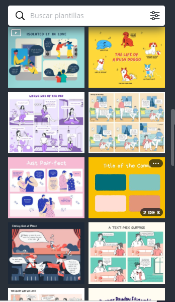 Ingresen a Canva y elijan una plantilla para tiras cómicas (disponibles aquí). Seleccionen una que tenga la cantidad de cuadros que necesiten según su boceto.
